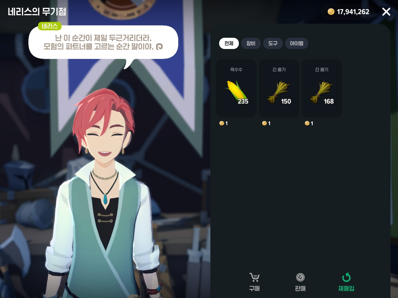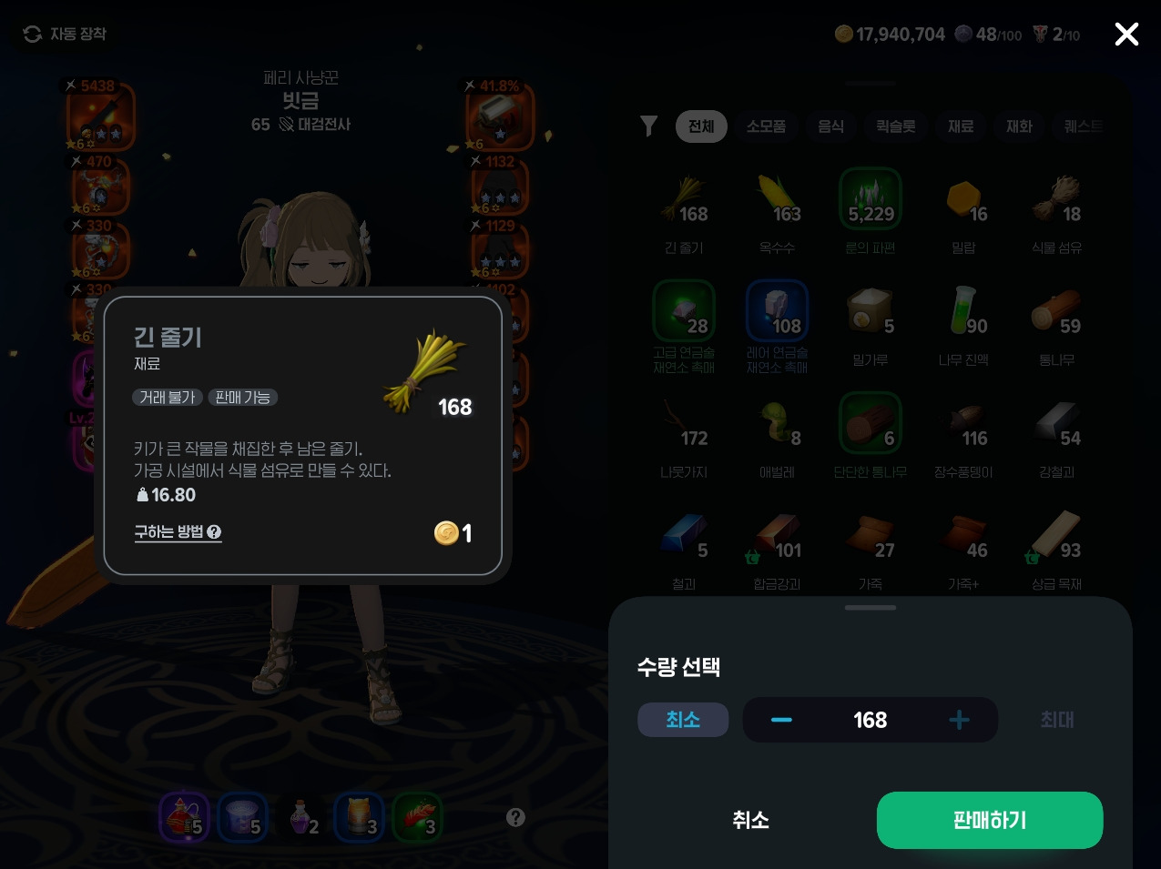 그리고 30분 정도 파밍한 다음 상점에서 재매입해서 그동안 모은 긴줄기를 사용할 수 있어요.